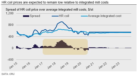 For ArcelorMittal, it appears they were able to divest some older assets at an attractive price. Through cycle EBITDA was defined as covering the 2017–2020 H1 period. Based on our cost and margin data, this was a particularly strong period for steelmakers, a period that is not expected to return for some time, particularly for that duration. The following chart shows HR coil prices versus average integrated mill costs and how they compare to the period preceding this and our forecast through 2023.