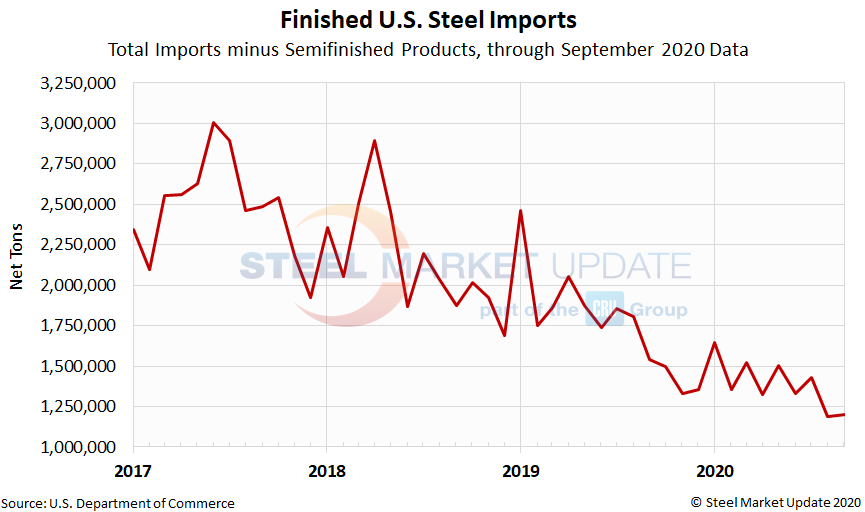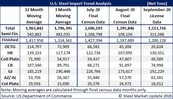 As shown in the figure below, finished steel import levels are much less volitile and more accurately display the U.S. steel import trend month-to-month. September finished imports remain well below levels seen earlier this year.