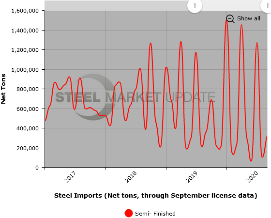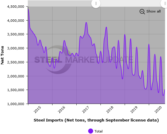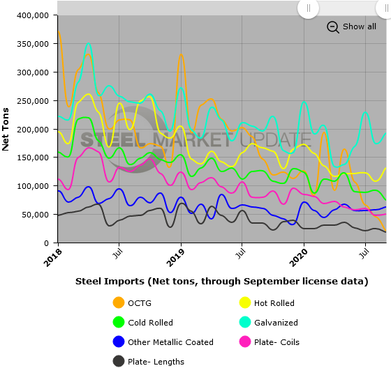 The three graphics below show total steel imports through September license data. To provide the most clarity, we are only showing a limited time line in each graphic. To see a greater data history and utilize our interactive graphing features, you can visit our website. Contact us at info@SteelMarketUpdate.com if you have any questions.