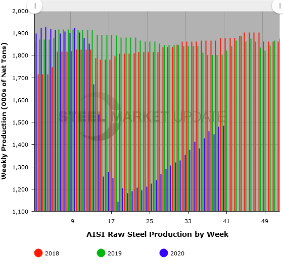 Adjusted year-to-date production through Oct. 3 totaled 59,444,000 net tons at an average utilization rate of 66.2 percent. That is down 19.6 percent from the same period last year when the utilization rate was 80.3 percent, AISI said.