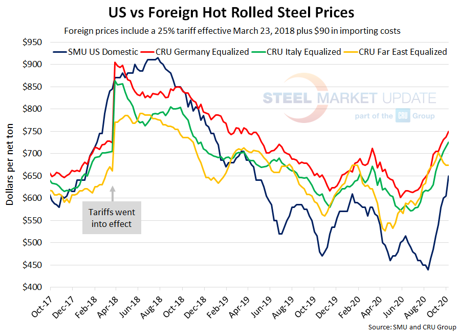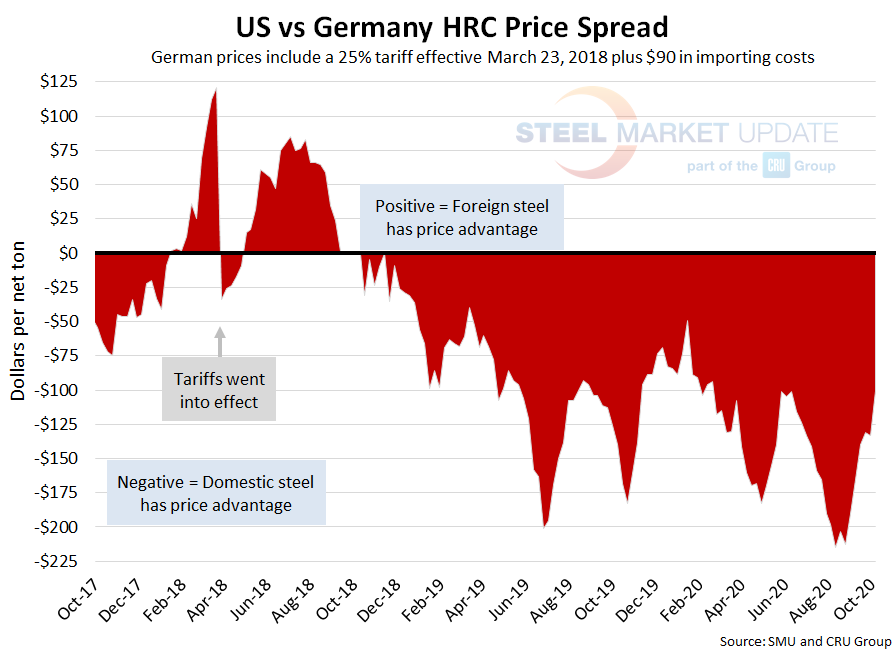 As of Wednesday, Oct. 7, the CRU German HRC price was $528 per net ton, up $10 from the previous week and up $15 from two weeks prior. Adding tariffs and import costs, that puts the German price at $750 per ton delivered to the U.S. The latest SMU hot rolled price average is $650 per ton, up $45 over last week and up $50 over two weeks prior. Therefore, domestically sourced HRC is theoretically $100 per ton cheaper than imported German HRC; the spread was $133 last week and $131 two weeks ago. Recall the record high spread of $215 per ton seen on Aug. 12. U.S. prices have held this price advantage for over a year and a half.