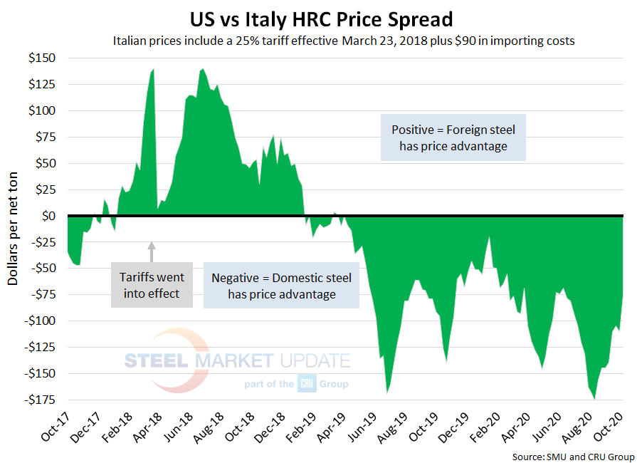 CRU published Italian HRC prices at $508 per net ton, up $8 from last week and up $16 over two weeks ago. After adding tariffs and import costs, the delivered price of Italian HRC is approximately $725 per ton. Accordingly, domestic HRC is theoretically $75 per ton cheaper than imported Italian HRC; the spread was $110 the previous week and $105 two weeks prior. Recall the record high spread of $176 per ton seen in mid-August. U.S. prices have held this price advantage for over one year.