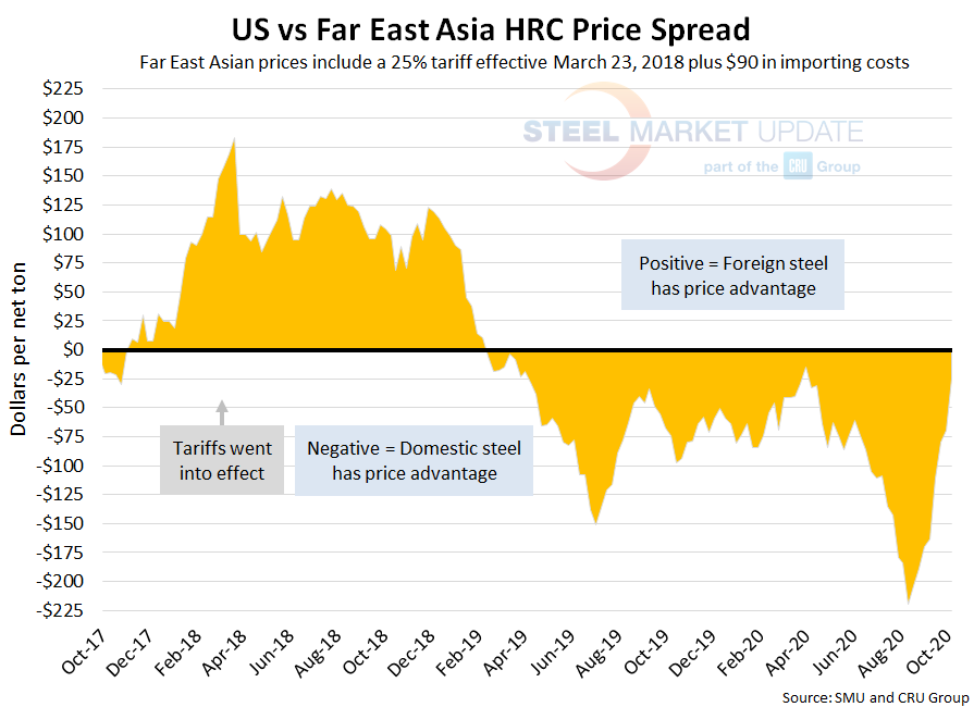 The CRU Far East Asian HRC price remained unchanged over last week at $467 per net ton, $5 lower than the price two weeks ago. Adding tariffs and import costs, the delivered price of Far East Asian HRC to the U.S. is $674 per ton. Therefore, U.S.-produced HRC is theoretically $24 per ton cheaper than imported Far East Asian HRC; the spread was $69 last week and $80 two weeks ago. Recall the record high spread of $220 per ton seen on Aug. 12. Domestic prices have held this price advantage for over a year and a half.