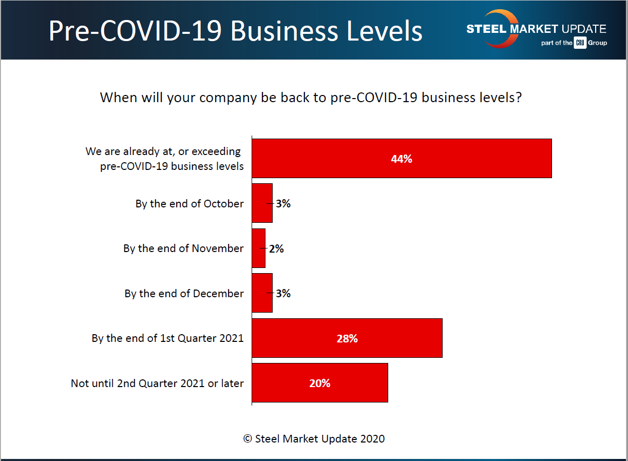 Nearly three out of four (72 percent) of the service center and OEM executives responding to Steel Market Update’s questionnaire last week said they feel upbeat about their company’s prospects in the fourth quarter. Yet SMU received twice as many negative comments as positive ones. Clearly, even the optimists are concerned about COVID and the sustainability of steel prices.