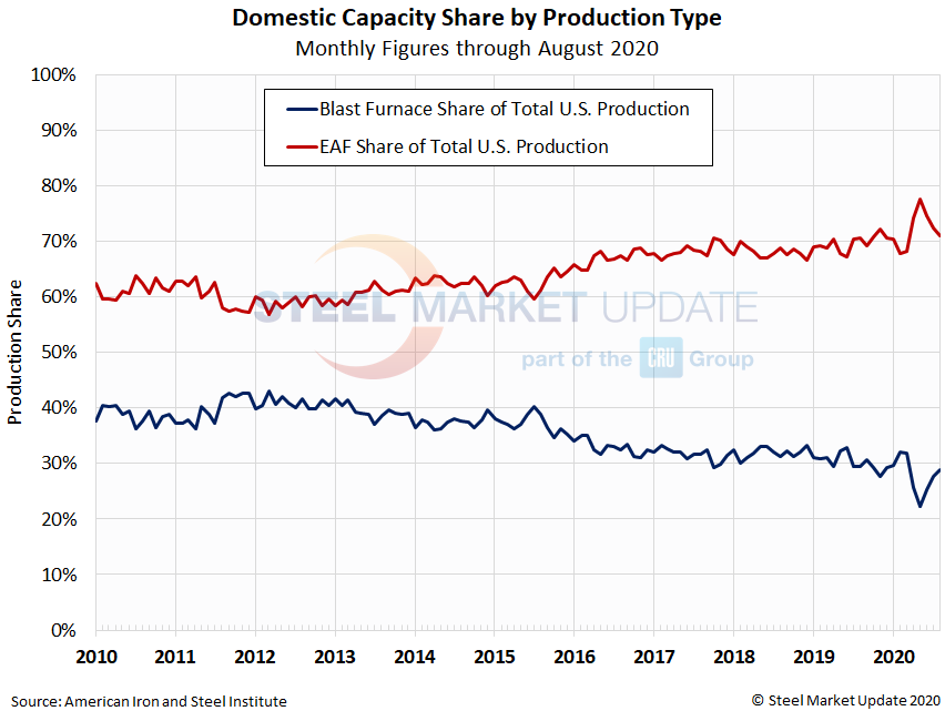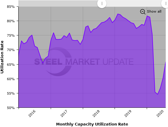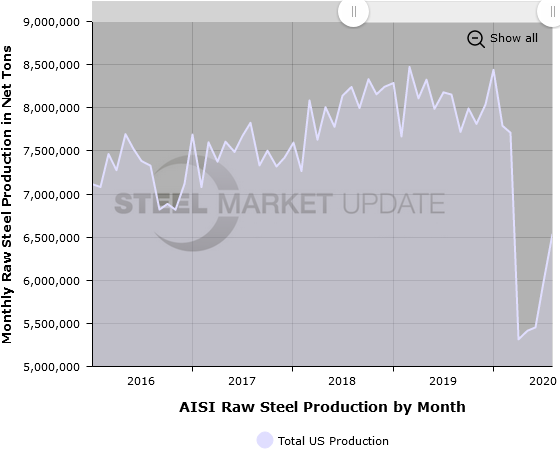 SMU Note: Interactive versions of these raw steel production graphics can be seen in the Analysis section of our website here. We have detailed regional data available as well. If you need assistance logging into or navigating the website, contact us at info@SteelMarketUpdate.com.