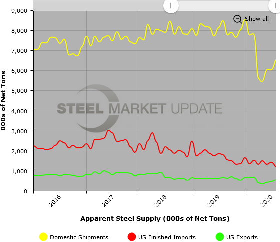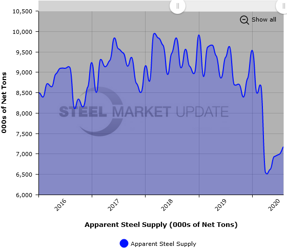 To see an interactive graphic of our Apparent Steel Supply history (example shown below), visit the Apparent Steel Supply page in the Analysis section of the SMU website. If you need any assistance logging into or navigating the website, contact us at info@SteelMarketUpdate.com or 800-432-3475.
