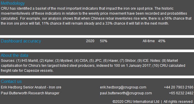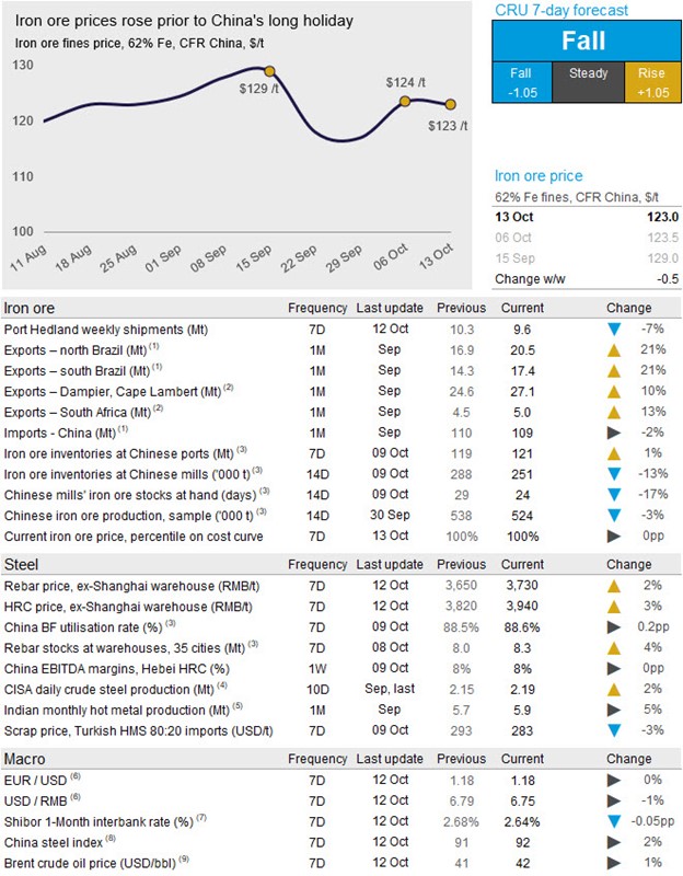 Iron ore prices have remained steady in the past week as a price increase last Thursday was met by similar falls in the past few days. Steel prices in China have risen after the holidays on an optimistic demand view, but iron ore availability has improved in the past week with port stocks exceeding 120 Mt for the first time since March. On Tuesday, Oct. 13, CRU has assessed the 62% Fe fines price at $123.0 /dmt, down marginally w/w.