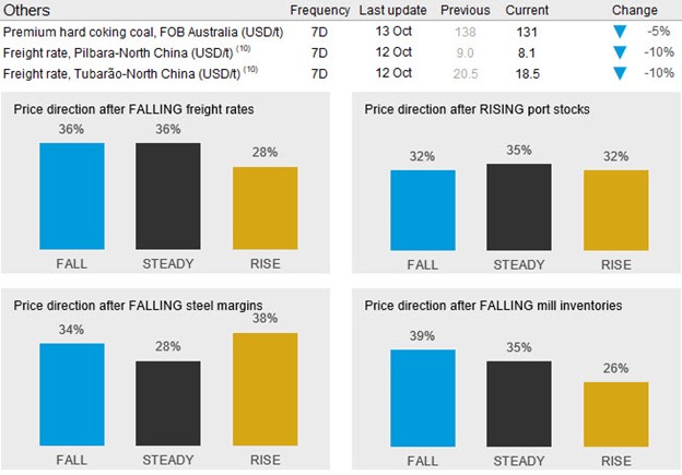 Seaborne supply remained steady in the past week, with Port Hedland shipments dropping, while Rio Tinto managed to deliver the strongest week of the year. At the same time, shipments from northern Brazil held steady at a high level to offset a drop in exports from Minas Gerais. The steady seaborne supply is a significant improvement y/y as exports fell sharply at the start of October in 2019.