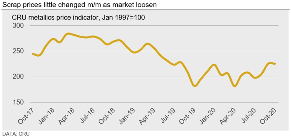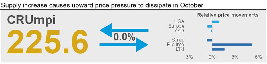 The CRU metallics price indicator (CRUmpi) was unchanged m/m in October at 225.6 following large price increases the prior month. Supply in many markets became more available as prices rose, and this helped prevent additional upside pressure. For November, market sentiment is that prices will again be little changed, and we do not see much in the way of substantial upside or downside pressure.