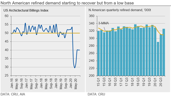 We understand that demand from general galvanizers has continued to be stable over the past month, having remained far more robust than demand in other sectors throughout the pandemic. Covid-19 disruption has had little impact on residential housing, and we expect starts to be 0.8% higher in 2020 than in 2019. Commercial construction has taken more of a hit, with the U.S. Chamber of Commerce Commercial Construction Index remining far below pre-Covid-19 levels in Q3. The forward-looking AIA Architectural Billings Index remained in contraction in August for the sixth consecutive month. Again, commercial construction was highlighted by the AIA as a point of weakness and it noted that the ongoing pandemic has impacted the number of proposals becoming active projects. A key risk is that delayed and cancelled projects in the U.S. will impact end-use zinc demand in coming months.