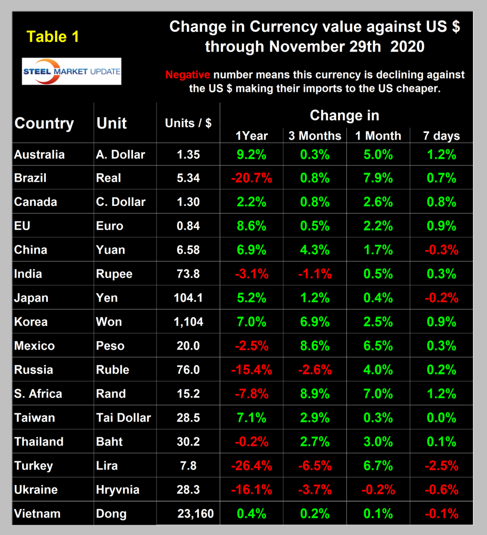 Steel Market Update tracks the currencies of the 16 pre-eminent global steel and iron ore trading nations on a daily basis and reports monthly. The currencies of these 16 don’t necessarily follow the Broad Index value of the U.S, dollar but in the last four months have done so. The latest value of the Broad Index as published by the Federal Reserve was Nov. 20, on which date the dollar was down by 10.0 percent since March 23 and down by 3.5 percent in three months. At the three-month level, the daily broad index has declined almost every day since May 14. Our country data from Oanda was current as of Nov. 29.