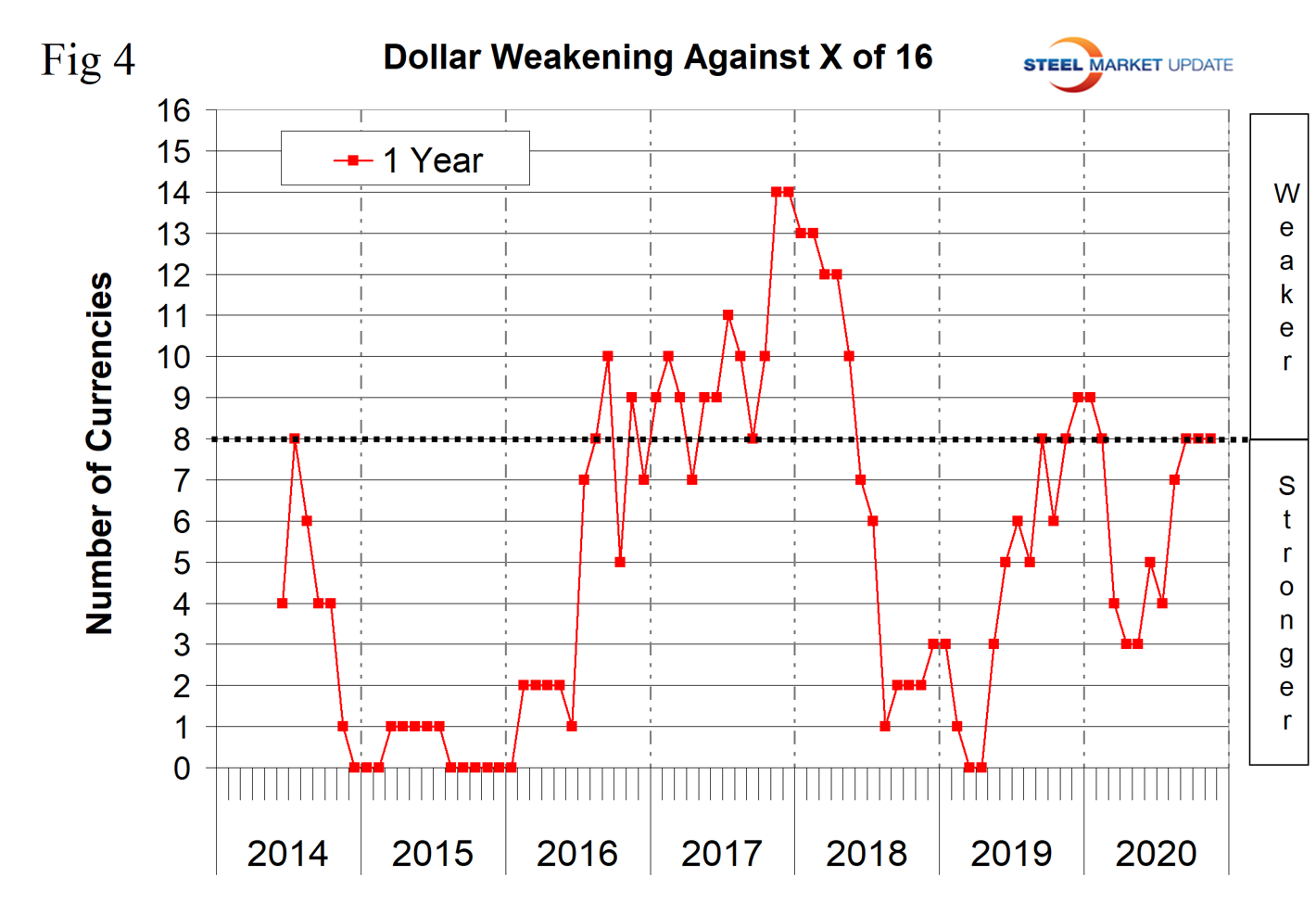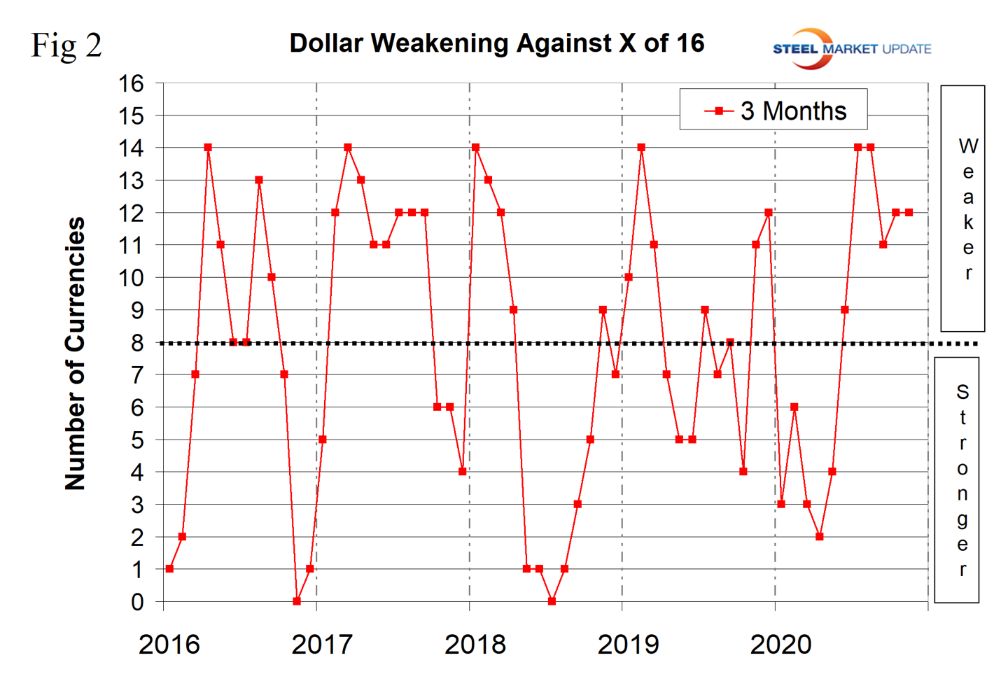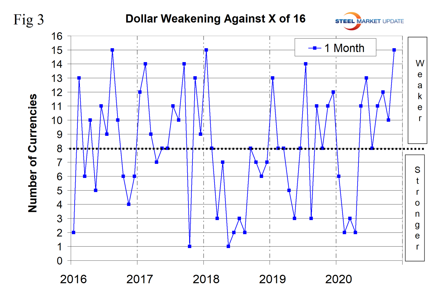 Figure 4 shows the 12-month picture, which removes some of the volatility by showing the number of currencies against which the dollar was weakening on a year-over-year basis. In March and April 2019, the dollar strengthened against all 16 at the 12-month level. There was a progressive weakening until December 2019 and January 2020 when the dollar weakened against nine of the 16. This was followed by a strengthening through April and May and a renewed decline through mid-September. In the 12 months leading up to the end of November 2020, the dollar weakened against eight of the 16. A weakening dollar puts upward pressure on globally traded commodity prices including most steelmaking raw materials.