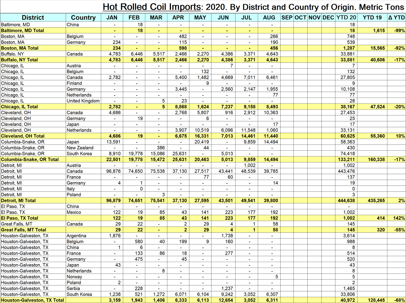 Premium members will find reports on our website that break down the import tonnage in 2020 through August into the port of entry and country of origin in metric tons. Products analyzed in this way are HRC, CRC, HDG sheet, OMC sheet, CTL plate and coiled plate. This data set is large; therefore, we will make no attempt to provide a commentary. Each reader’s interest will be different and he or she simply needs to select one of the six products, then find the nearest port or ports of entry to see how much came into their locality each month and from where. Monthly data is provided back to January 2018. It is clear from these reports and from our companion reports by region that the change in tonnage entering a particular district in most cases is different from the change in volume at the national level.