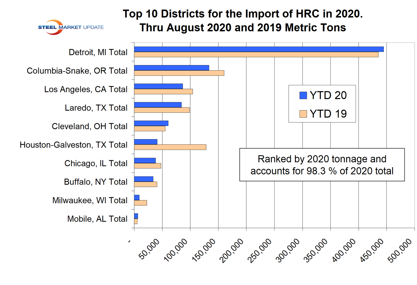 The table included here is a small part of the detailed analysis of the hot rolled coil tonnage by district of entry and source nation. The bar graph shows the tonnage of HRC sheet that entered the top 10 districts through August year to date for 2019 and 2020 ranked by 2020 tonnage. These 10 districts accounted for 98.3 percent of the total HRC sheet tonnage in 2020 through August.