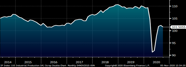 Q3 U.S. GDP grew at an annualized quarter-over-quarter rate of 33.1% and was a combination of 1) pent-up Q2 production, 2) government stimulus and 3) Q3 production times some coefficient less than one due to the pandemic-induced recession. The industrial production index below illustrates the sharp Q2 drop followed by this Q3 recovery, which brings us around halfway back. Most of the pent-up Q2 production has dissipated and there is no additional government stimulus for now. Without these boosters, expect flattish trend growth moving forward.