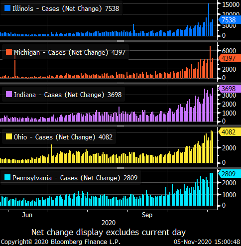 According to the CDC COVID Data Tracker, there were 106,537 new cases on Wednesday. I have been sounding the alarm this was coming for almost two months and now it is here. The pattern has been extremely reliable across Europe into Russia, Canada and even now it is starting to take hold in Turkey. These Midwest states are seeing exponential growth, growth that will continue unabated until restrictions are put in place. Further, California, Texas and Florida have yet to experience this growth. When they do, new daily cases will explode into the 150k-200k/day. Regardless of the intensity of restrictions put in place, this will dramatically weigh on the U.S. economy.