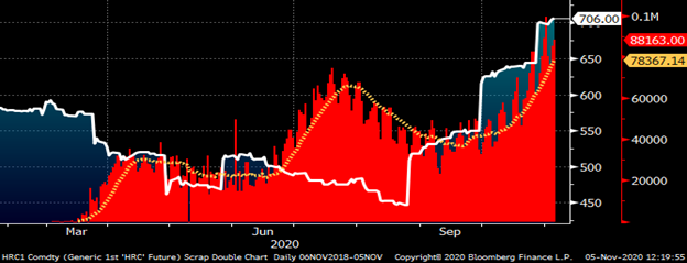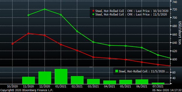 Based on the shape of the CME Midwest HRC futures’ curve, market participants are expecting the price to fall dramatically in early 2021. However, since mid-October, the downward sloping curve has seen a healthy increase with the December future trading as high as $720 today for a $60 gain, while the January 2021 future gained $70/t.