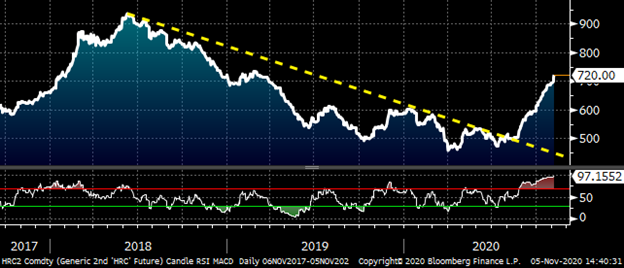 Steel and manufacturing in aggregate also experienced a sharp drop in demand in Q2 followed by a breakneck snap-back that started in August and has carried us into November. Back in August, demand shot ahead of the temporarily decreased domestic steel supply/capacity. This resulted in two straight months of almost $100/t sequential increases in the hot rolled index with further increases already priced in for November.