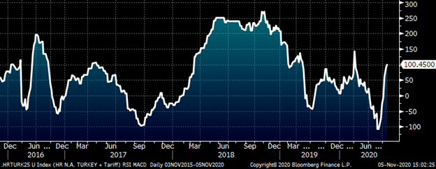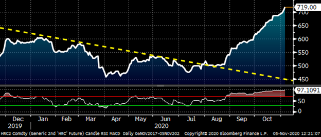 In the lower panel of the chart of the rolling 2nd month CME HRC future below is the technical indicator, the “relative strength indicator,” or RSI. This measures the velocity of the move in a security. If the RSI is above 75, it indicates the product is overbought. If it is below 25, it is oversold. Notice HRC2 has been in overbought territory since late August without slowing. In fact, the RSI continues to make higher highs and is at 97 today. The RSI only goes to 100 folks. Even the rally in 2018 (see above) had a period where prices relented and the RSI retreated from overbought territory. Something has to give.