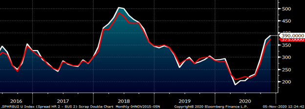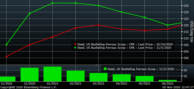 Again, something has to give. Either HR has to come down or busheling has to rally in order to bring this relationship back in line. After weeks with little buy side interest, the busheling futures finally got busy last week gaining $20-25 in the months of December, January and February, with the last two trading smalls above $340/lt yesterday.