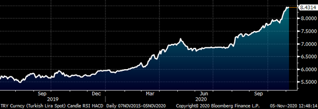 What’s more, not only is Turkey the only country other than China to increase their YTD steel production, but their currency has devalued significantly over the past month. This chart shows how many lira per U.S. dollar.