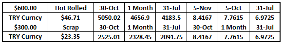 This table shows that the currency devaluation of the lira in just the last month translates into an additional $47/t when converting $600 from dollars into lira further widening the differential? Further, it increases the price of U.S. export scrap by approximately $23.