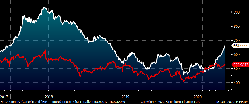 Rolling 2nd Month CME HRC Future $/st (white) & November CME Busheling Future $/lt (red)