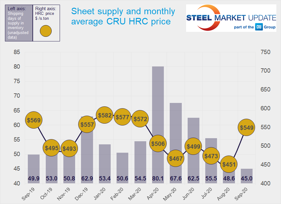 The further decline in inventories in September, as manufacturing activity picked up, explains the 21.7 percent jump in average CRU HRC prices m/m. Mill lead times have extended with not only robust contract orders but also sizeable spot orders as mill order books became tight, as some service centers were caught short. Mills continue to push up prices and are reportedly targeting $700 /st HRC.