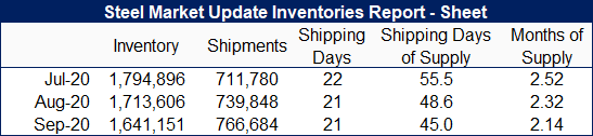 Service center flat roll inventories fell significantly month on month as shipments increased and mill lead times extended. The SMU service center inventories data for September shows that service centers carried 45 shipping days of supply of flat roll at the end of the month, which was down from August’s adjusted total of 48.6 shipping days. In terms of months, September inventories represented 2.14 months of supply, down from 2.32 months in August.