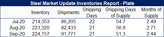 While the sheer volume of plate in stock at service centers was flat m/m in September, with higher shipments, the number of shipping days of supply decreased in September. Service centers carried 51.3 shipping days of plate supply in September, down from 56.9 days in August. This translates to 2.44 months of plate supply on hand in September versus 2.71 months in August. Similar to sheet, plate supply on hand fell to the lowest level since we started recording data in January 2019.
