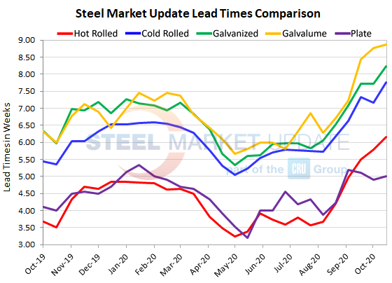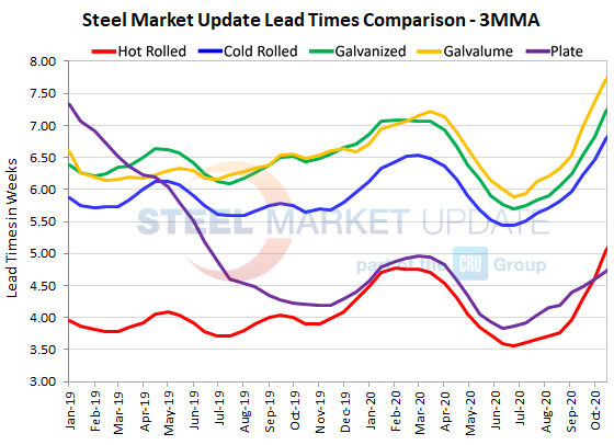 Looking at three-month moving averages, which smooth out the variability in the biweekly readings, lead times for flat rolled and plate have continued moving outward since late June. The current 3MMA for hot rolled is 5.05 weeks, cold rolled is 6.80 weeks, galvanized is 7.23 weeks, Galvalume is 7.72 weeks and plate is 4.72 weeks.