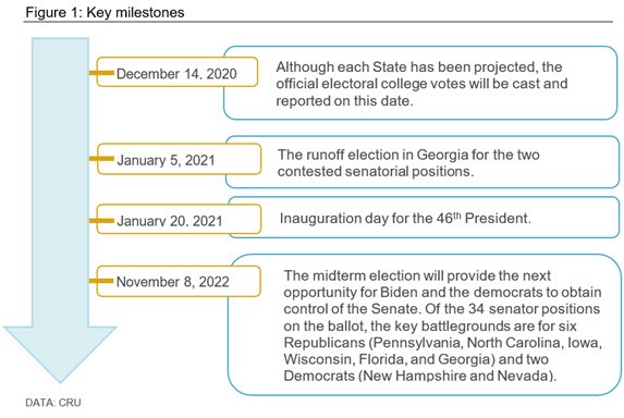 It now seems clear that Joe Biden will become U.S. president in January, although Trump has launched a range of lawsuits challenging the process. Figure 1 shows the remaining milestones in this electoral cycle.