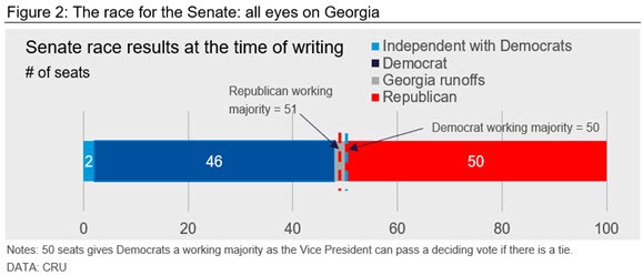 If the Democrats fail to win a majority in the Senate, this will limit their economic ambitions under a Biden administration. Trade is the area where Biden will retain most room to maneuver. He should be able to make some progress on his environmental agenda, although with limited new spending. On fiscal policy more broadly, a Republican Senate would limit his spending plans to areas where there are overlapping priorities. In the near term, a further stimulus package is likely to pass shortly after Biden is inaugurated.