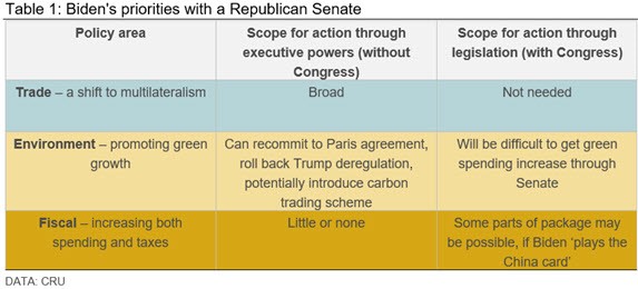 In our pre-election slide deck, we set out the three key areas where a Biden administration would pursue a different policy agenda to Trump: trade, environmental and fiscal policy. What is Biden likely to be able to achieve in each of these areas without a Senate majority? Table 1 summarizes how a Republican Senate interacts with each of Biden’s three policy priorities.