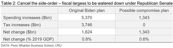 However, the net effect could still provide a modest boost to the economy. Table 2 shows an example. Supposing that Biden can pass only one quarter of his spending plans, and none of his tax plans (given Republican preferences against tax rises), the net fiscal stimulus drops from around 0.8% of GDP per year to 0.6%. Although more modest, that will still offer some tailwind for the economy.