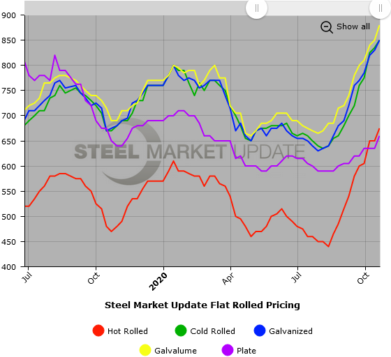 SMU Note: Below is a graphic showing our hot rolled, cold rolled, galvanized, Galvalume and plate price history. This data is available here on our website with our interactive pricing tool. If you need help navigating the website or need to know your login information, contact us at info@SteelMarketUpdate.com.