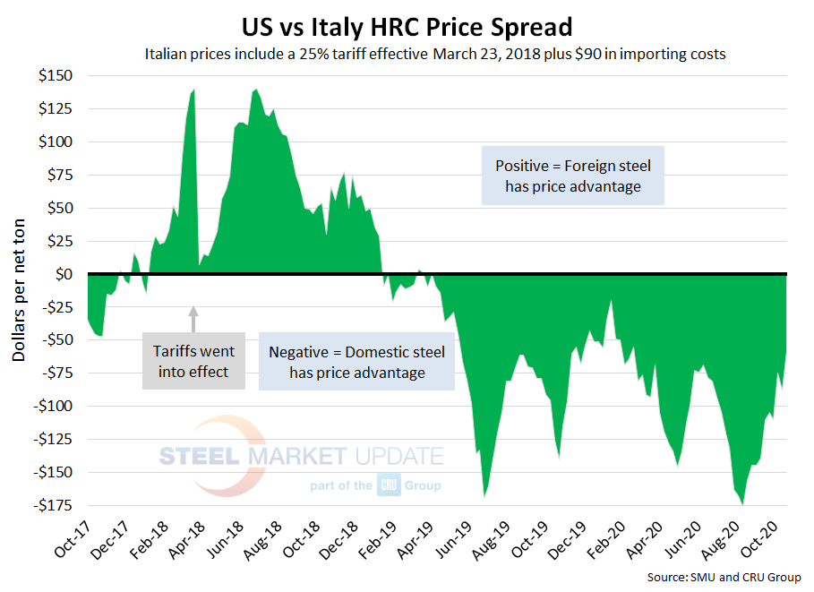 CRU published Italian HRC prices at $514 per net ton, down $4 from last week, but up $6 over two weeks ago. After adding tariffs and import costs, the delivered price of Italian HRC is approximately $733 per ton. Accordingly, domestic HRC is theoretically $58 per ton cheaper than imported Italian HRC; the spread was $88 the previous week and $75 two weeks prior. Recall the record high spread of $176 per ton seen in mid-August. U.S. prices have held this price advantage for over a year and a half.