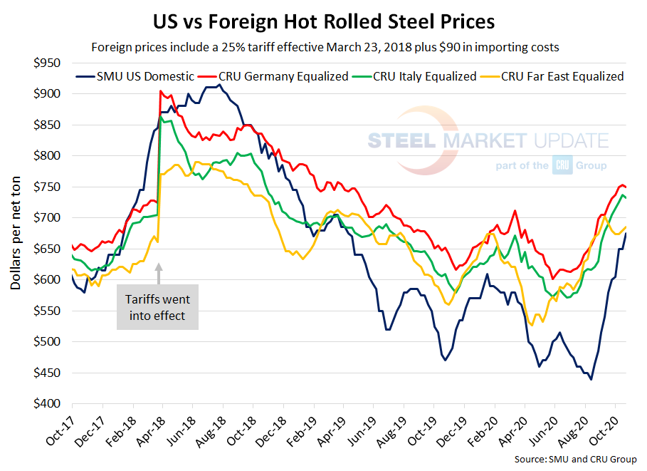 The CRU Far East Asian HRC price increased $4 from last week to $476 per net ton, $9 higher than the price two weeks ago. Adding tariffs and import costs, the delivered price of Far East Asian HRC to the U.S. is $685 per ton. Therefore, U.S.-produced HRC is theoretically $10 per ton cheaper than imported Far East Asian HRC; the spread was $30 last week and $24 two weeks ago. Recall the record high spread of $220 per ton seen on Aug. 12. Domestic prices have held this price advantage for over a year and a half.