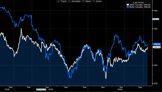 With the exception of the front two months, the scrap curve actually weakened on a week/week basis. October’s scrap mart was a bit soft, and this sentiment lingered into the middle of the month. Comparing the U.S. Busheling contract to the LME Turkish scrap contract shows a slight premium in scrap here in the U.S. This seems to be a relatively normal state of affairs over the past couple of years: