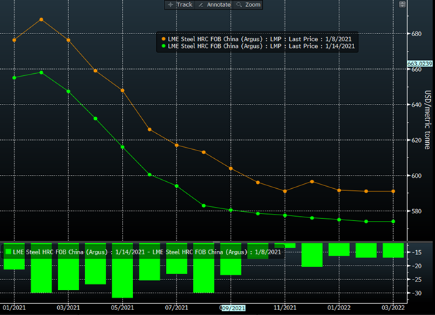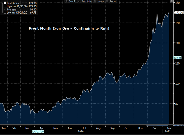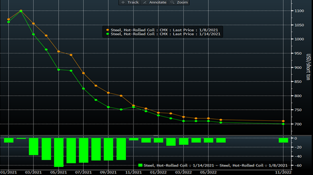 So far, nearly nine million people have been vaccinated in the U.S., and some experts believe that we will be vaccinating one million people per day very shortly. We hope that the feared “post-holiday surge” actually fizzles out—and maybe the recent slowdown in case growth is a sign that this could indeed be happening. However, the pandemic has wreaked havoc on supply chains around the world, and we are seeing some signs that production may be disrupted in some key steel consuming industries. Not necessarily from the inability to get steel, but on shortages of other components. In addition, there has been a rise in cases in China, and it seems to be a new strain of the virus. The Chinese government acted very swiftly to shut things down when the virus first hit in early 2020, so there are some concerns that something similar could happen this time around as well. You can see by the below chart that the Chinese steel futures have pulled back over the past week: