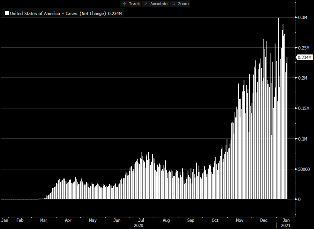 Yes, on a week/week basis, HRC futures actually pulled back after the epic run we have seen over the past few months. May is down over $50! There could be a number of reasons for this. Certainly, the latest wave of Covid cases has some worried about more dramatic shutdowns here in the U.S.—especially with a new administration coming in. However, looking at the Covid case growth here in the U.S., it’s too early to call the top, but the chart below looks like we might be rolling over a bit: