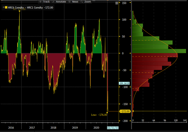 As opposed to the HRC curve, busheling scrap had some months that pulled back, but the curve actually rose week/week in the later 2021 months. Perhaps busheling traders are baking in some of the new EAF capacity that is starting up in late 2021…