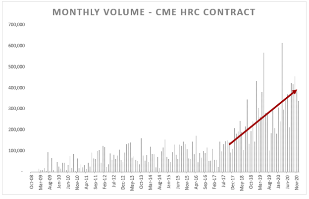 We will close this writeup with some comments about volumes. You can see the build in futures volumes over the past year. In total, over 4.4 million tons of steel traded on the exchange last year. Many market participants believe that the volume that trades “over the counter” or OTC is 1-2x the exchange traded volumes. So, if you think about it, there are perhaps 8-12 million tons of HRC futures or swaps being traded out there, so adoption is increasing at a rapid rate.
