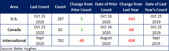 The number of active U.S. rigs increased by 5 to 287, with oil rigs up 6, gas rigs down 1, and miscellaneous rigs unchanged. Compared to this time last year, this week’s count is down 543 rigs, with oil rigs down 485, gas rigs down 60, and miscellaneous rigs up 2. See the first graph below for a history of active U.S. rig counts.