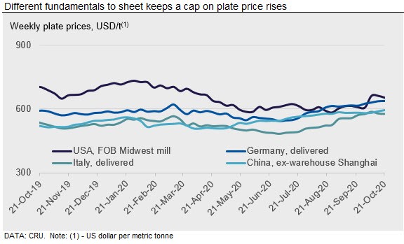 Overall, CRU’s Global Flat Products Price Indicator (CRUspi flats) rose by 7.3% m/m, reaching 162.9 in October, the highest level since May 2019.