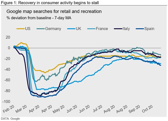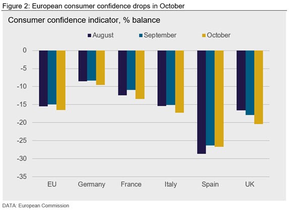 This slowdown in activity is already evident in some high frequency indicators. Figure 1 shows that after significant recovery over the summer, uses of Google Maps to locate retail and recreational establishments had begun to fall again in October. Figure 2 shows that consumer confidence in the largest European economies, after improving slightly in September, has dipped again in October. These trends have been evident even in Germany, which – until recently – had not seen the same increases in infection rates as France and Spain. This illustrates the importance of public perceptions. Even without statutory restrictions, if people are concerned for their health, then the economy will suffer.
