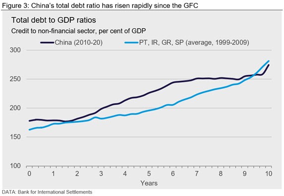 While the central government debt ratio remains low, leverage has built up rapidly in local government and corporate sectors, and there is a lack of transparency. Such rapid increases in debt ratios have historically often been associated with financial crises and/or sharp slowdowns in growth. This is illustrated in Figure 3; since 2009, China’s total credit to GDP ratio has increased at a similar pace to that of Portugal, Ireland, Greece and Spain (the so-called ‘PIGS’ countries) in the 10 years from the inception of the euro to the GFC.
