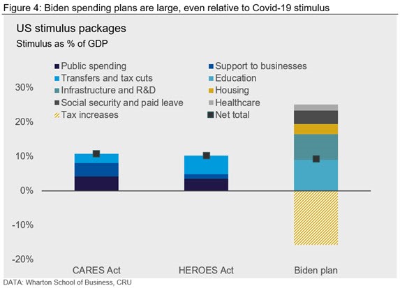 Fiscal plans: Biden has ambitious plans to increase spending in several areas, partly financed by higher taxes on corporate profits and payroll and income taxes for higher income households.