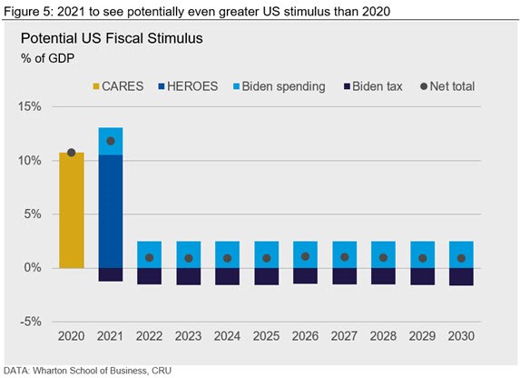 Biden’s spending will not be as rapidly disbursed as the emergency Covid-19 stimulus, as shown in Figure 5. However, taken together with a second emergency stimulus package, it could easily mean that the U.S. sees even greater fiscal stimulus in 2021 than in 2020. Biden’s spending may also have stronger multiplier effects on the economy. Fed research suggests that two-thirds of the CARES checks were saved or used to pay down debt, whereas spending on infrastructure, education and R&D should have stronger growth effects.