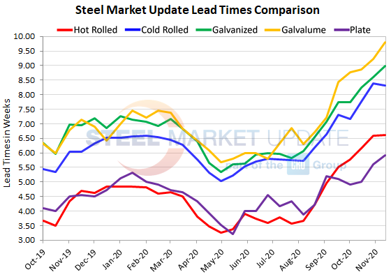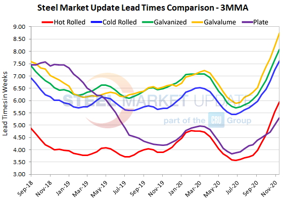 Viewed as three-month moving averages to smooth out the volatility, hot rolled lead times have continued to extend to 5.93 weeks, cold rolled 7.60 weeks, galvanized 8.06 weeks, Galvalume 8.72 weeks and plate 5.29 weeks.